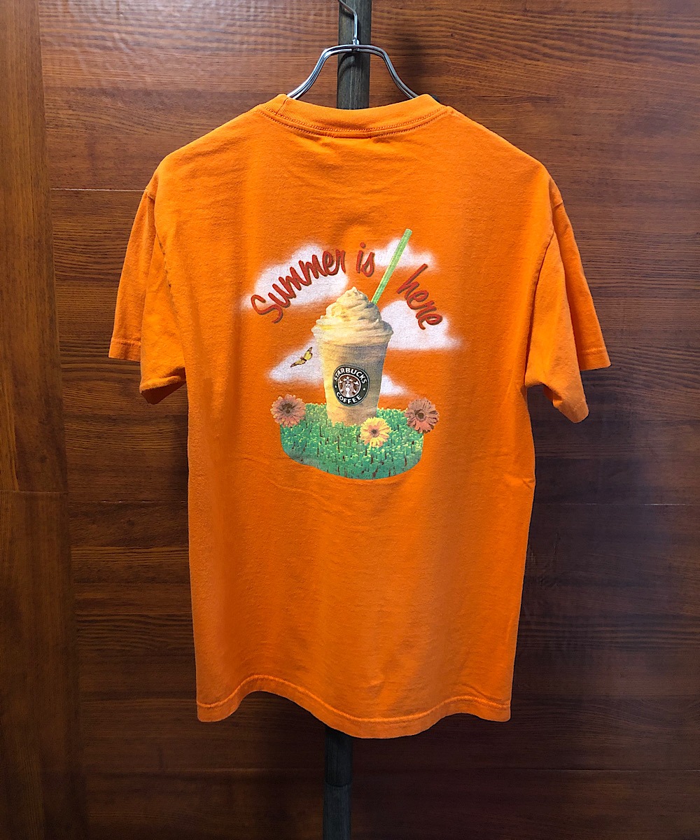 近年物のスターバックスTシャツ。Summer is here!→夏は来た!とおそらく期間限定メニューのTシャツ。夏に映えるオレンジがいいですね。