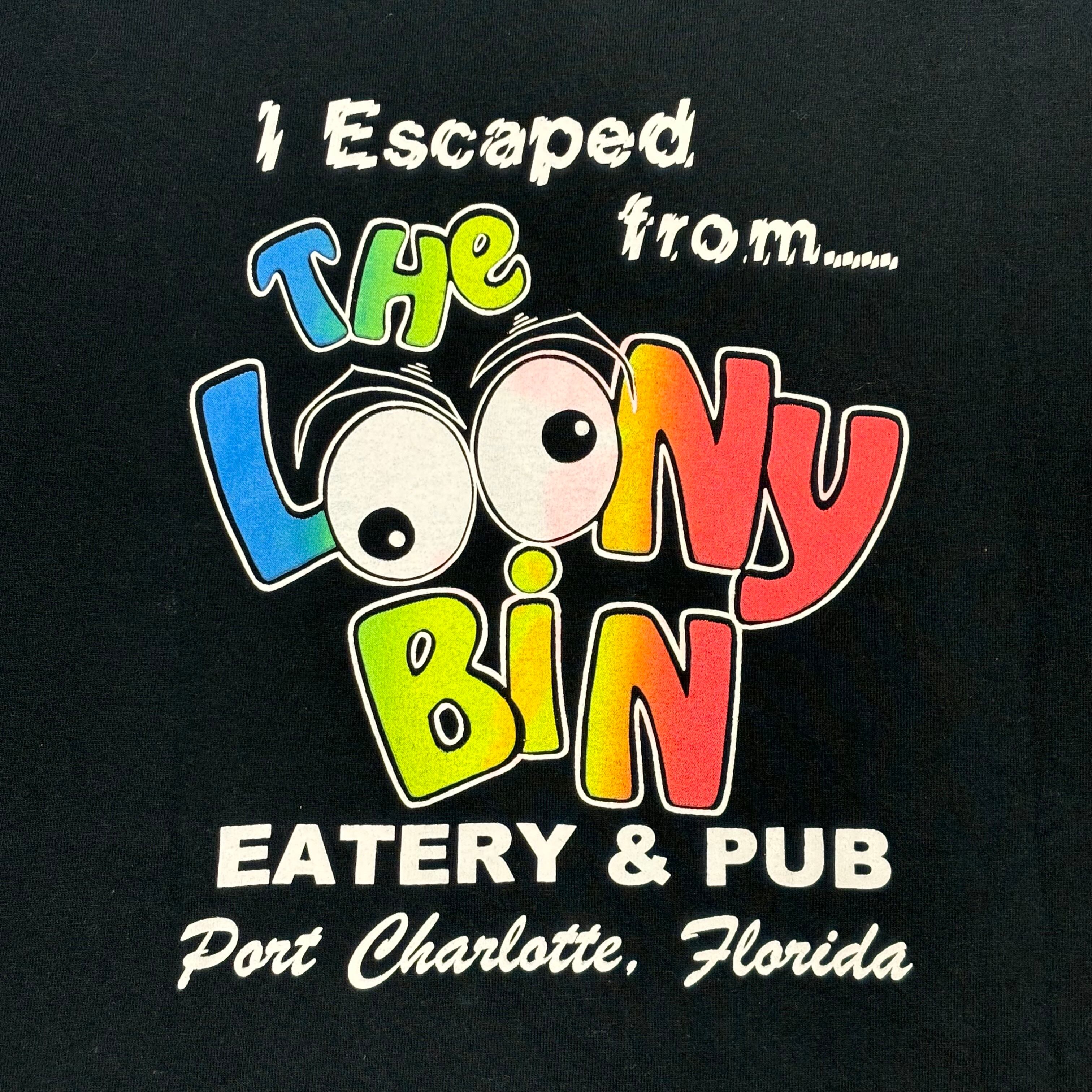 デザインにある「I Escaped from THE LOONY BIN」は、「私は精神病院から脱出した」というユーモアを込めたフレーズ。THE LOONY BINは、俗語で「精神病院」や「狂気の場所」を指し、冗談めかして「私はおかしな場所から抜け出した」という意味になります。