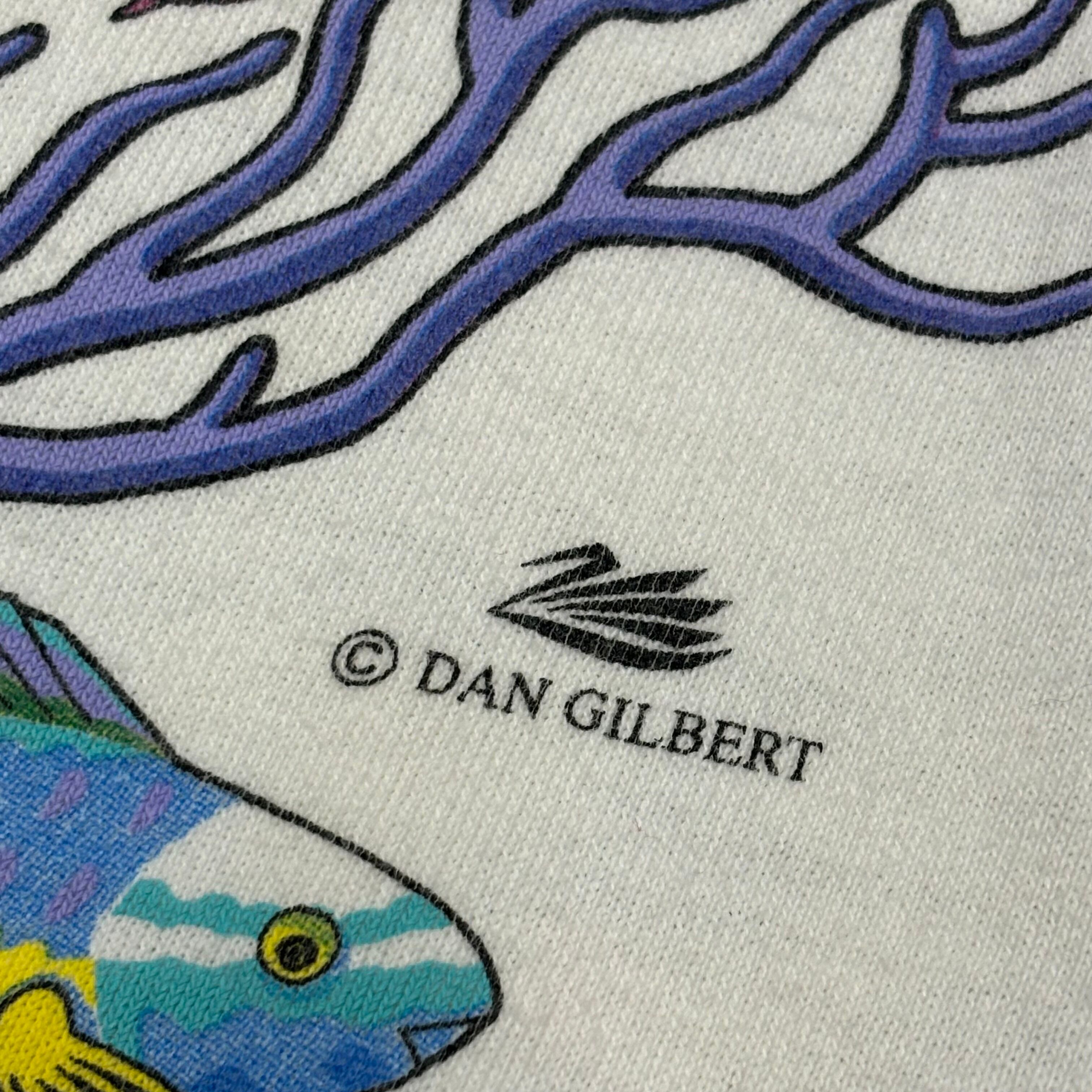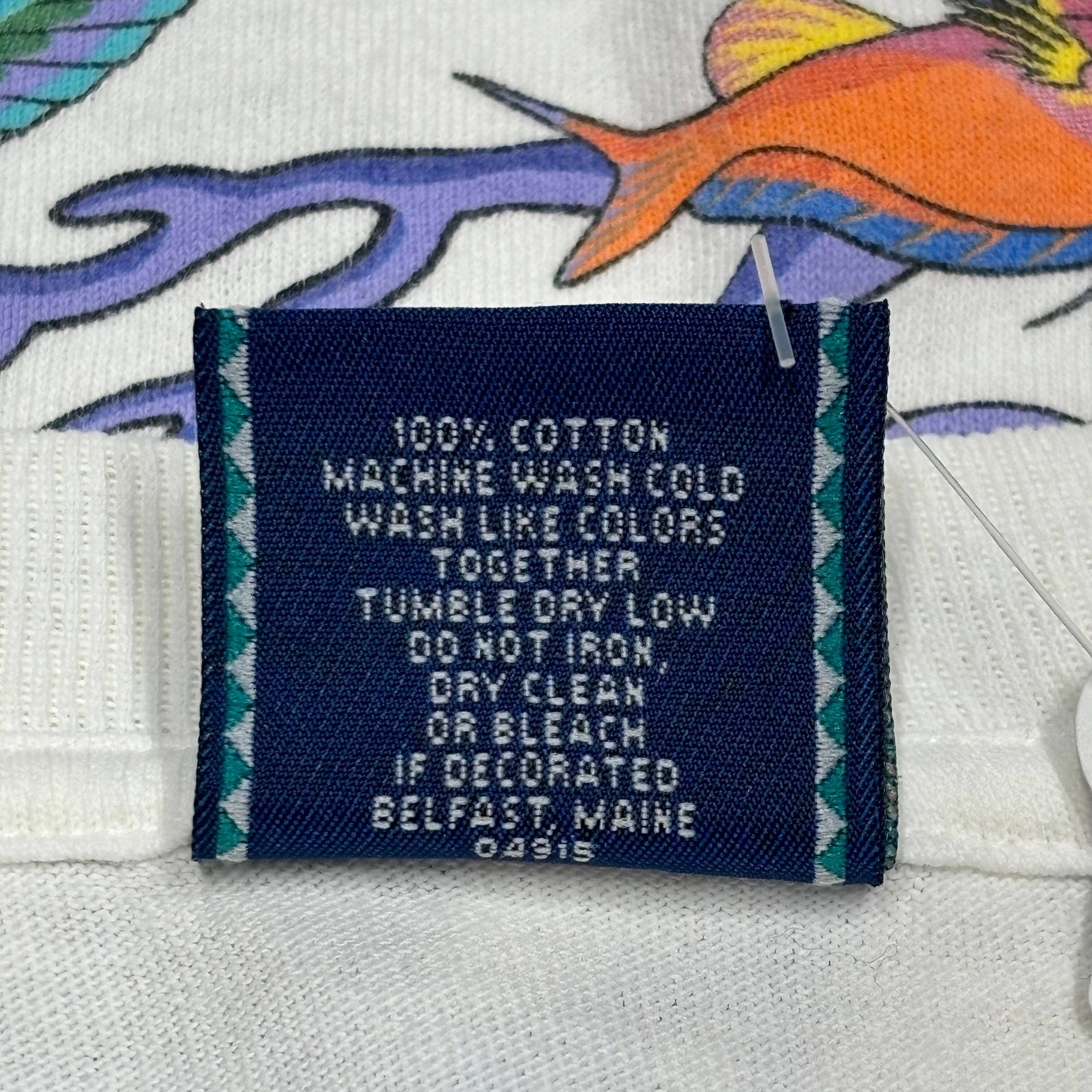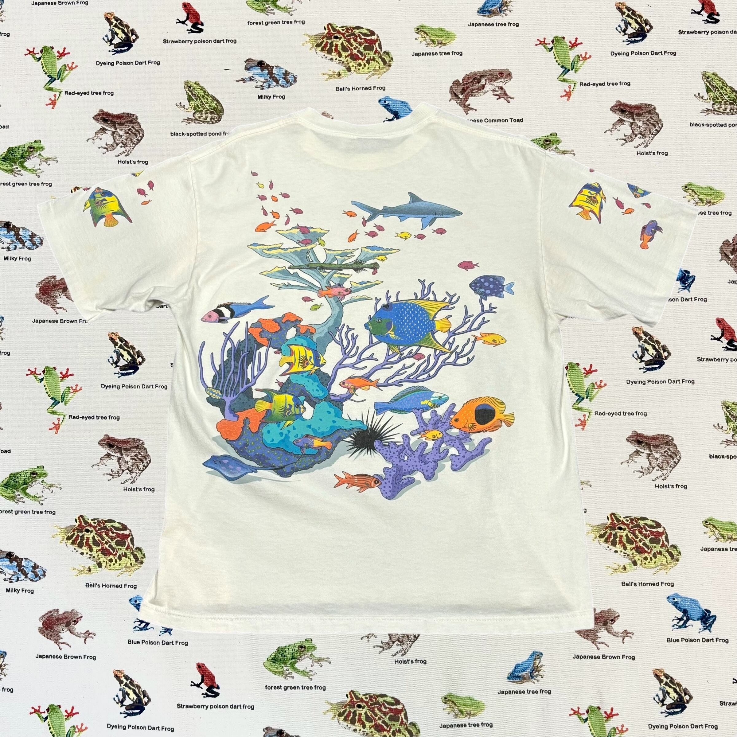 アクアリウム柄がフロントだけでなく、バック、両袖にプリントされ、海の中を覗き込むような綺麗なデザインが魅力的。L.L.Beanなどのアウトドアブランドにもグラフィックを提供していたブランドならではの繊細なタッチが光る一枚です。柔らかなコットン100%ボディ。アメリカ製。