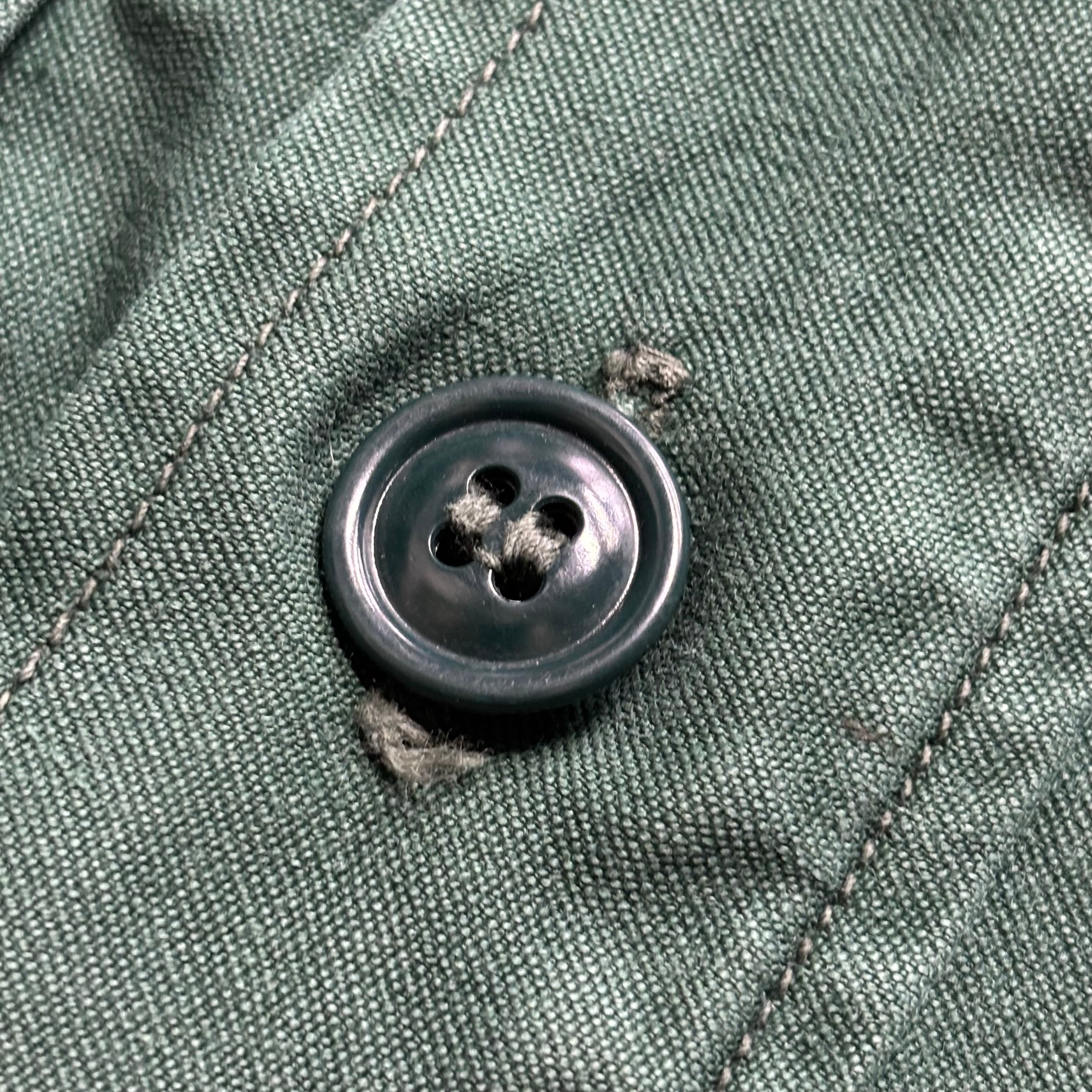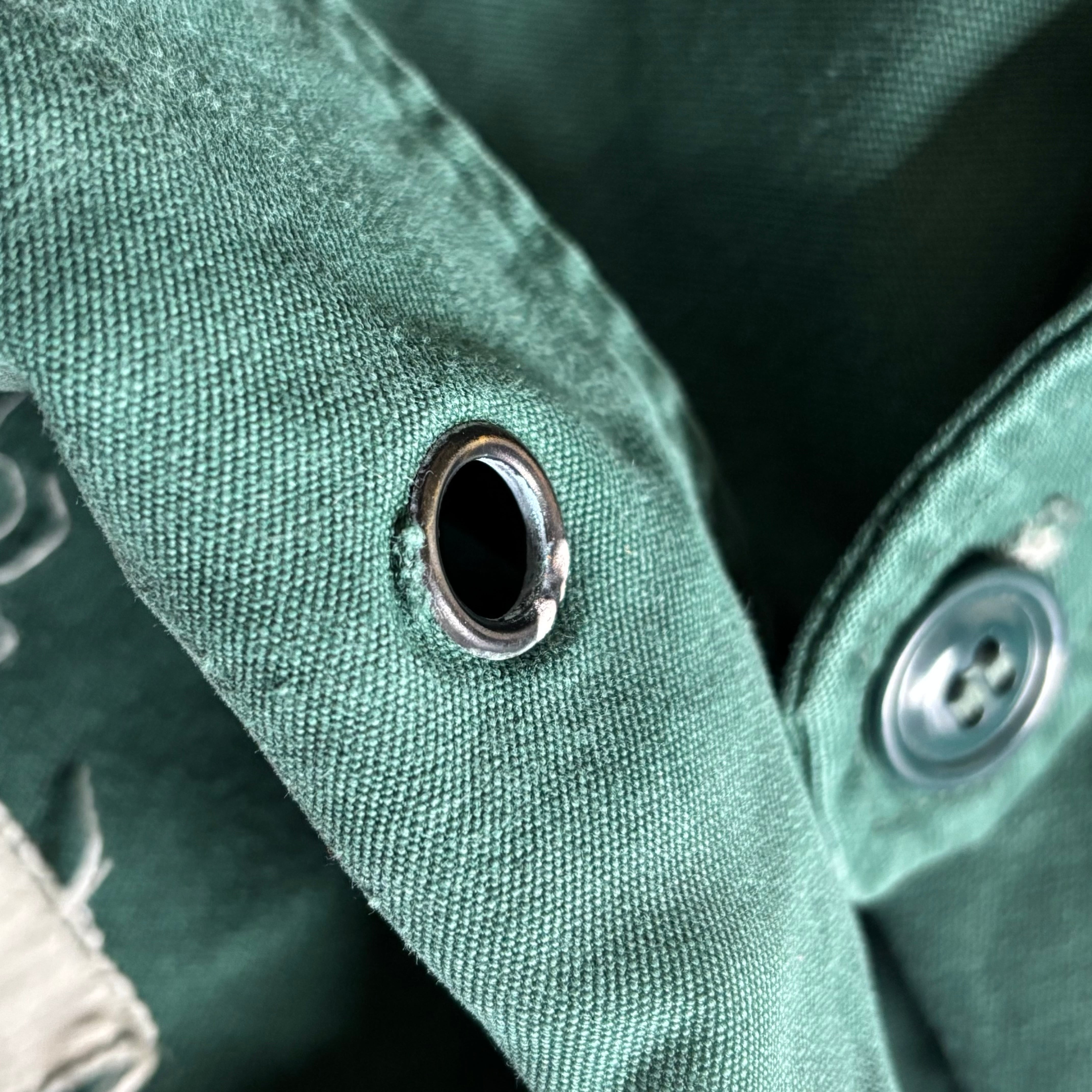 本品は、襟の形状が独特なプルオーバースタイルで、色味はGREEN 255と呼ばれるモスグリーン系の深みのあるカラー。戦闘服ながらもファッション性の高いデザインで、ヴィンテージミリタリーの中でも非常に珍しいアイテムです。