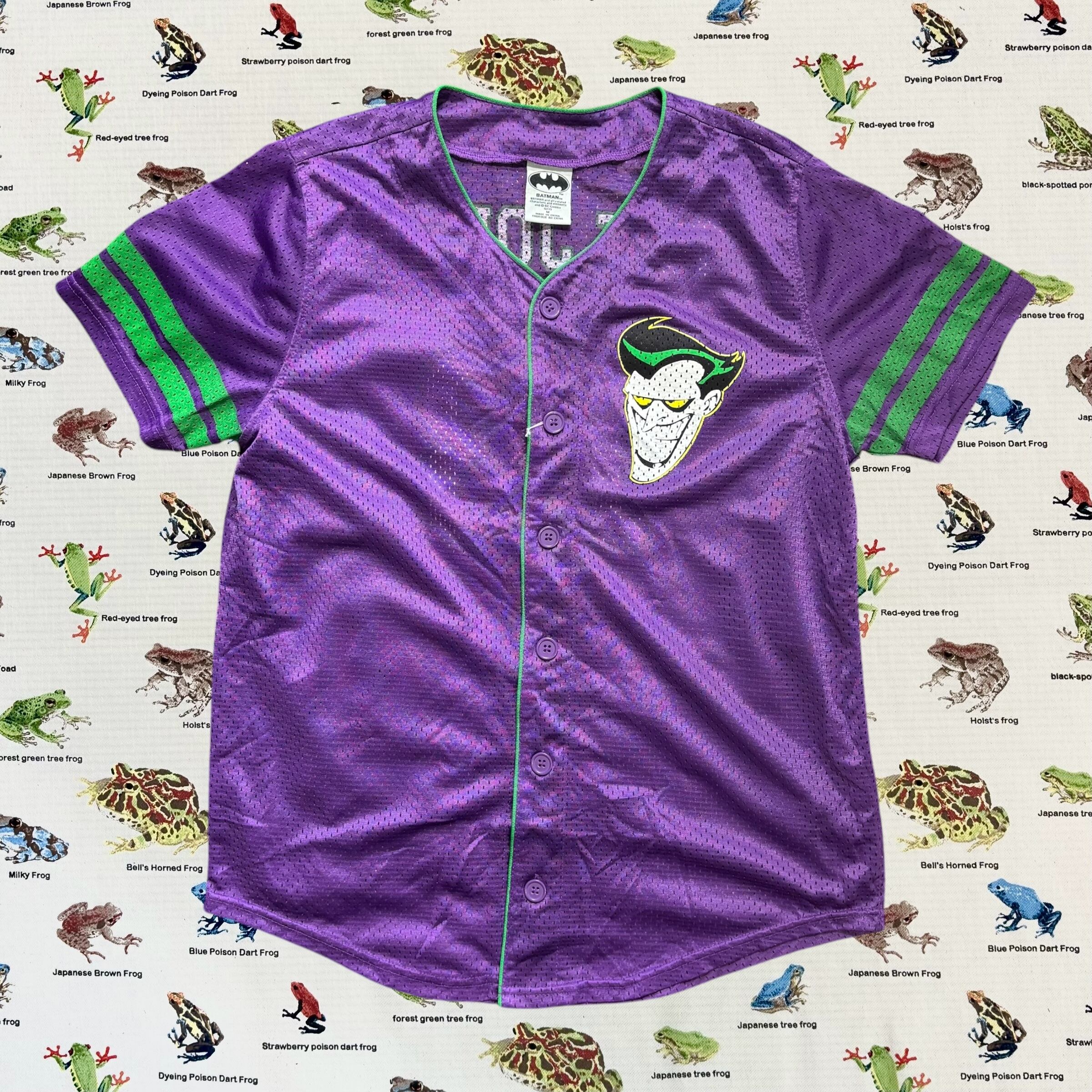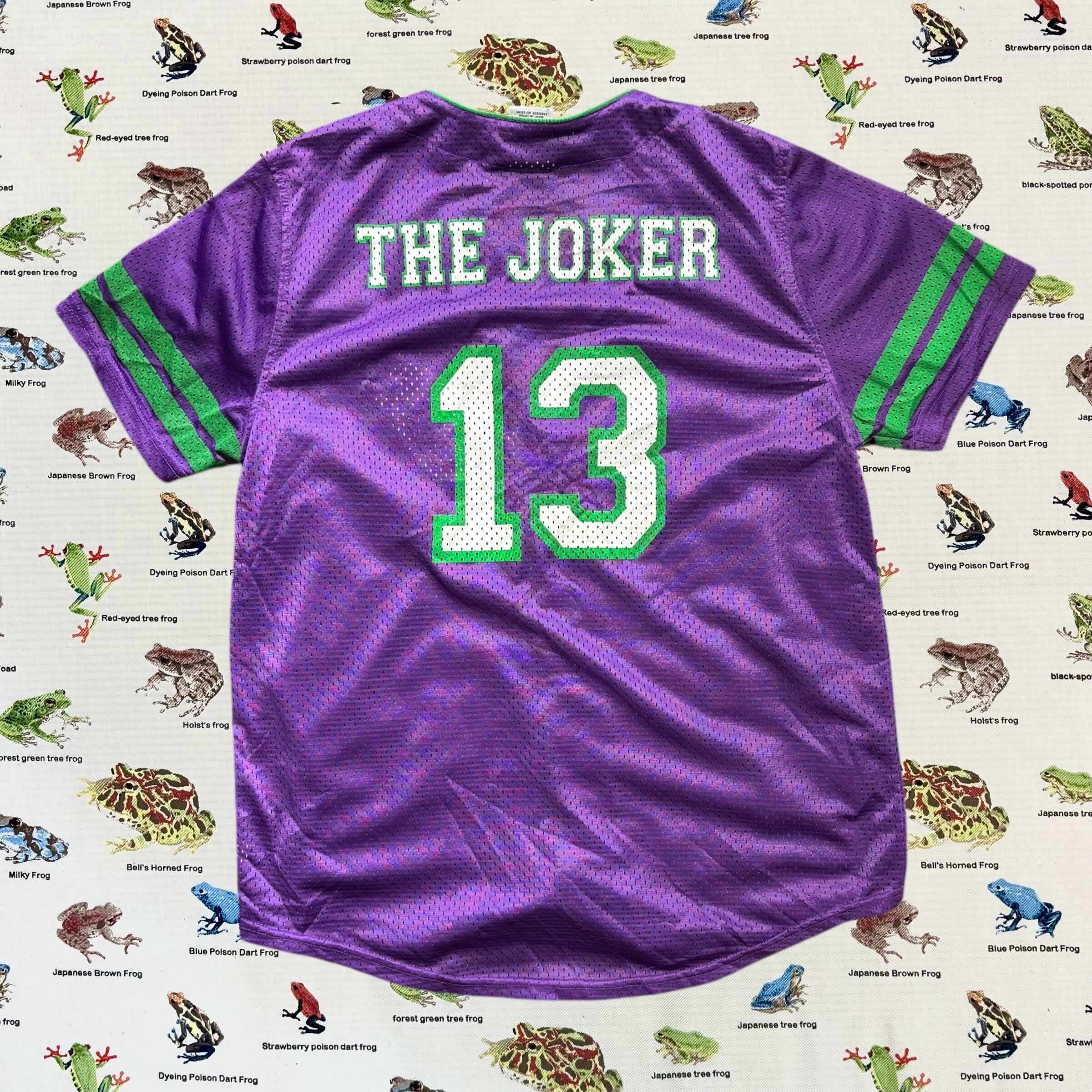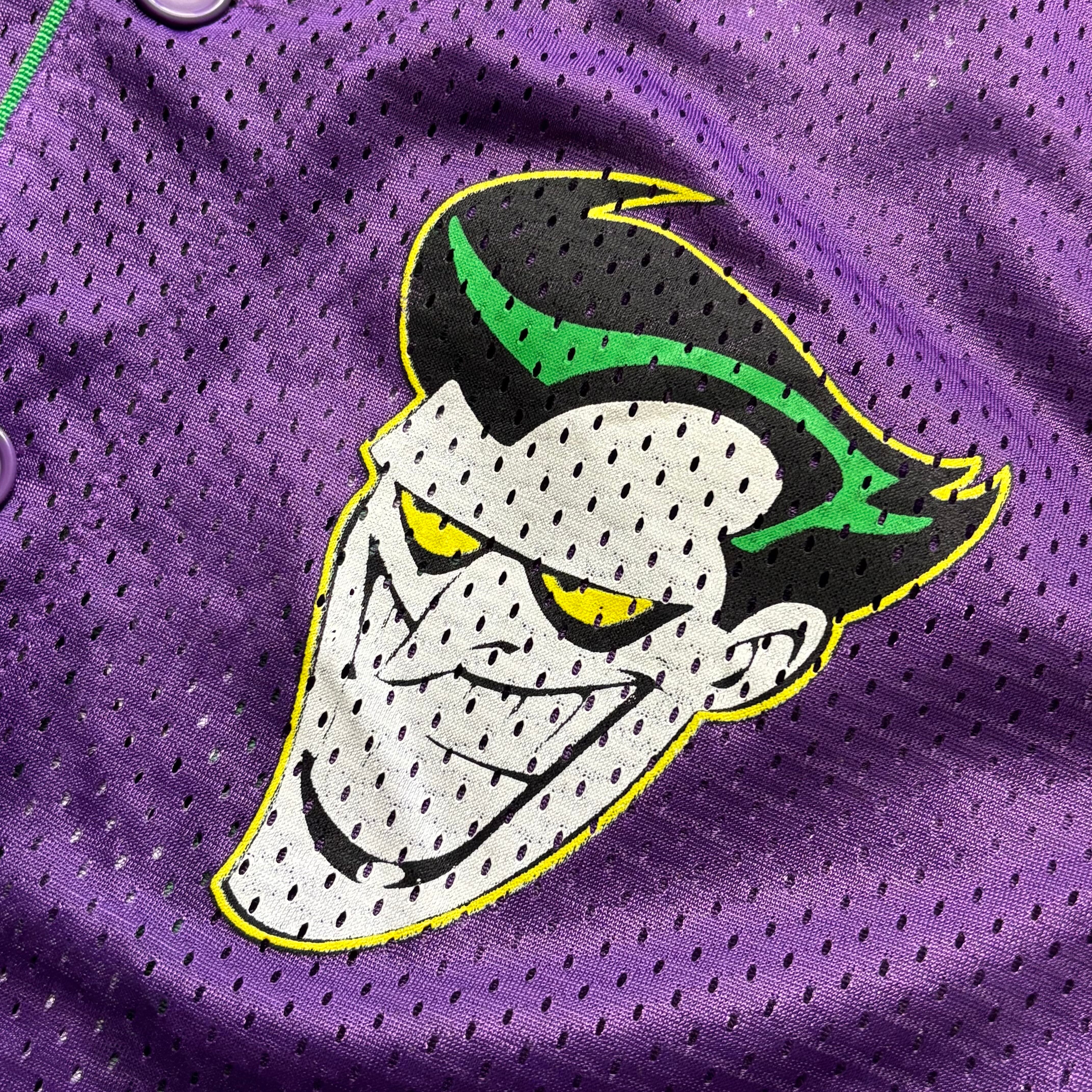 バットマンの絶対的なヴィラン、ジョーカーをテーマにしたユニークなベースボールシャツです。クラシックなアニメバージョンのジョーカーの顔が胸にプリントされたデザインは、ジョーカーファン必見の一着。