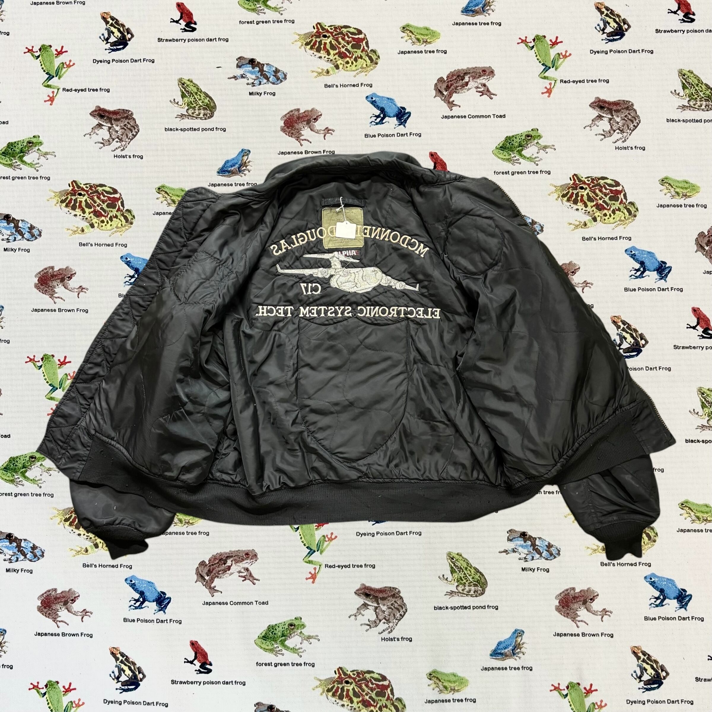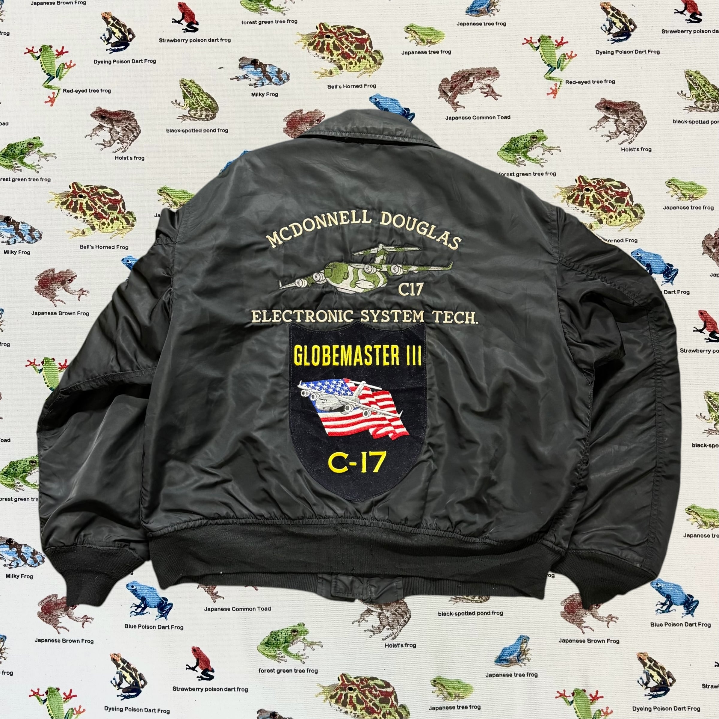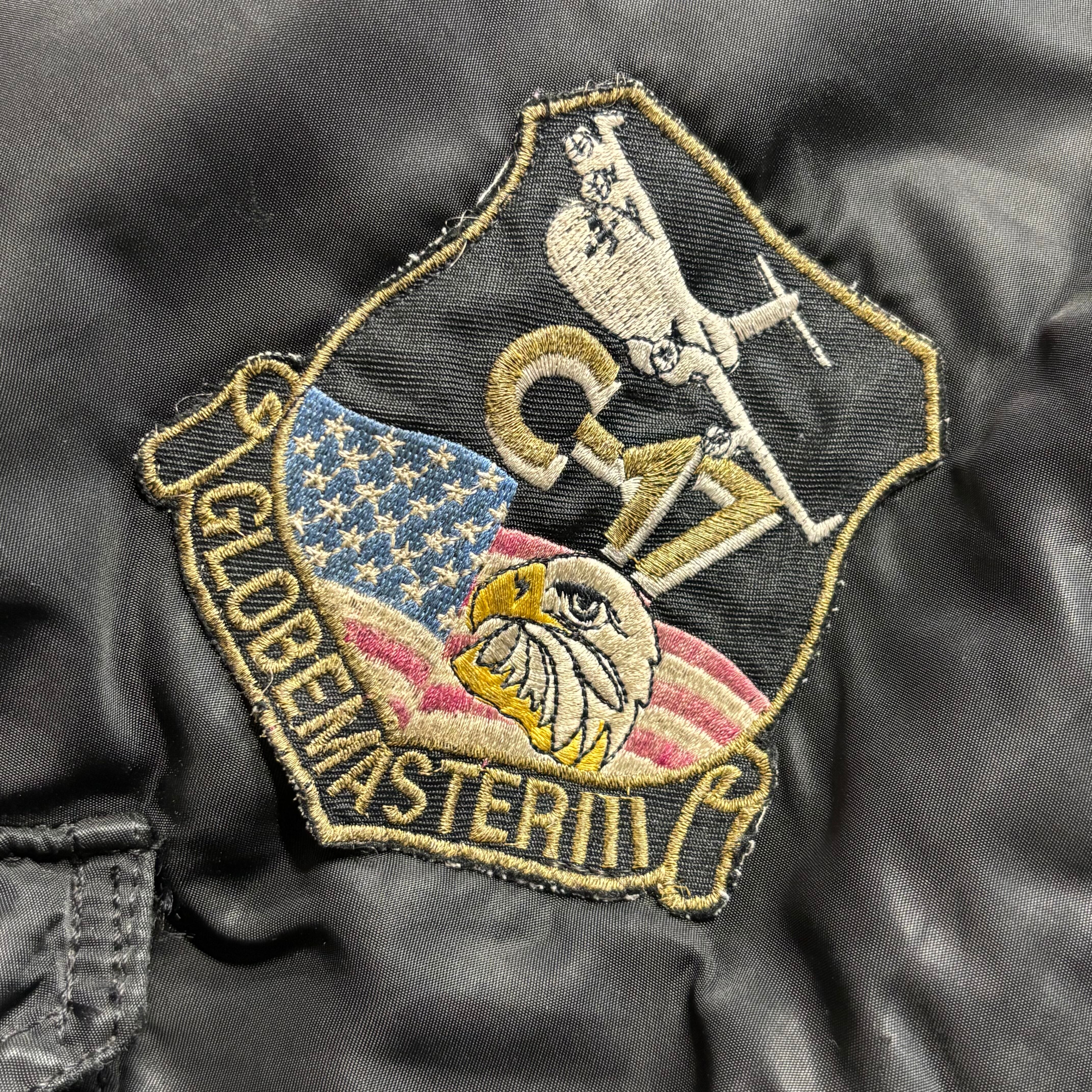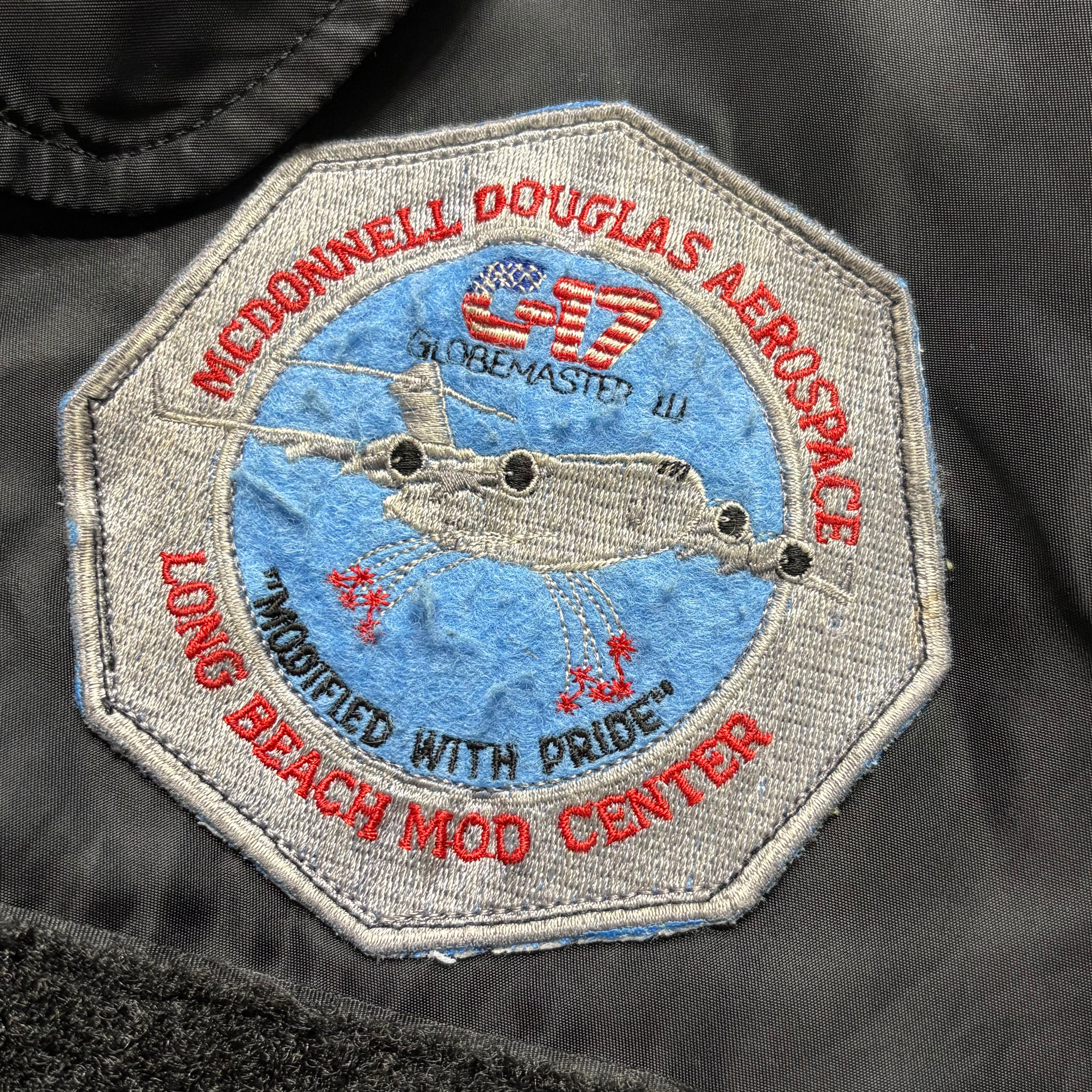 背面にはMcDONNELL DOUGLAS(現ボーイング)製のC-17を大きく刺繍したインパクトあるデザイン。胸や袖にもC-17関連のパッチが複数縫い付けられており、現場仕様のリアルな雰囲気が漂います。