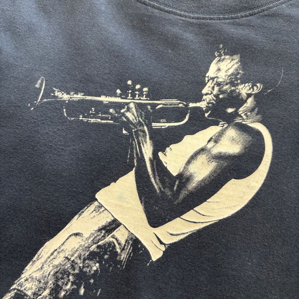 フロントにはトランペットを吹くマイルスのフォトプリントが大胆に配置され、背面にはアルバムタイトルをクラシカルな書体でプリント。まるでジャズアルバムのジャケットをそのまま着るような、静かなインパクトがあります。