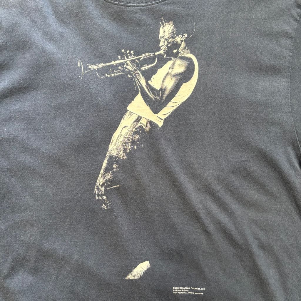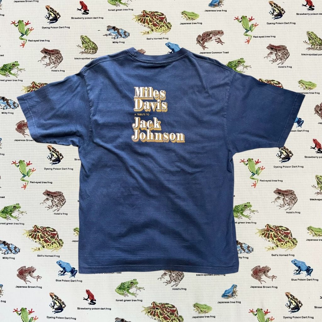 ジャズ界の帝王、マイルス・デイヴィスの名作『A Tribute to Jack Johnson』にオマージュを捧げた、2002年コピーライト入りのオフィシャルTシャツ。