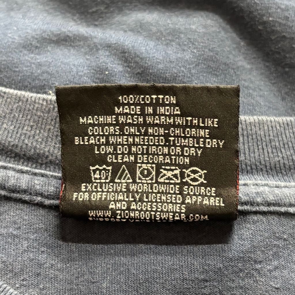 ボディはZION ROOTSWEAR製。やや厚みのあるしっかりとしたコットンで、インド製ながらアメリカンボディに近いシルエットと着心地。フェードしたネイビーが経年の味を際立たせています。