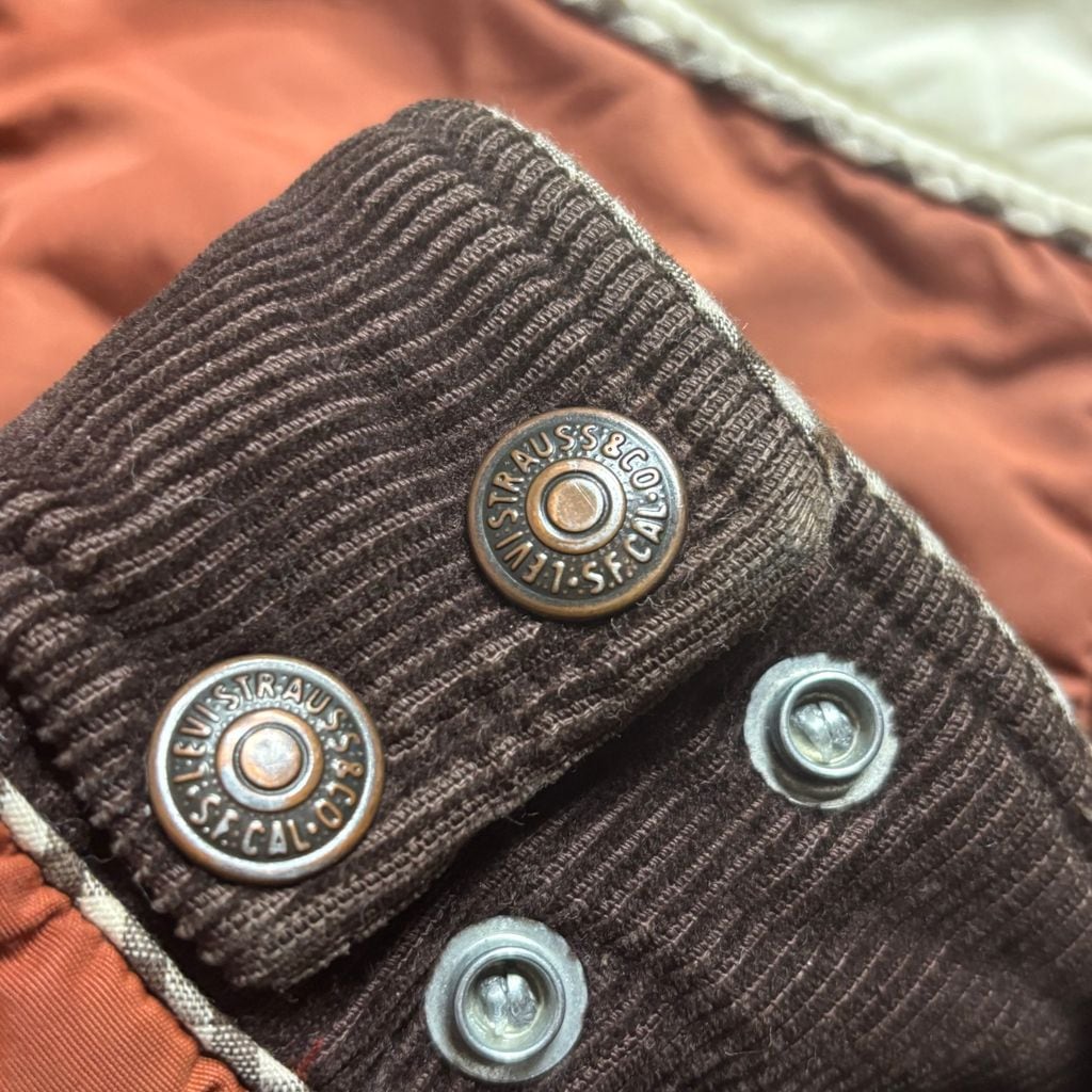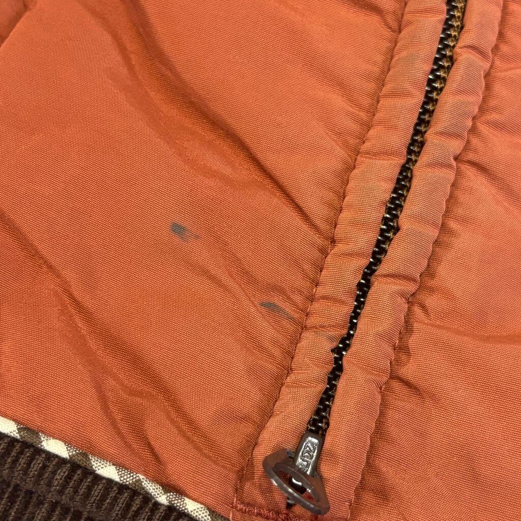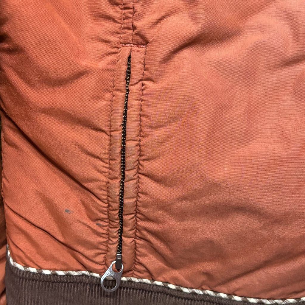 テラコッタ寄りのくすんだレッドに、アイボリー×ブラウンの切り替えヨーク、TALONジップと、ディテールも満載。