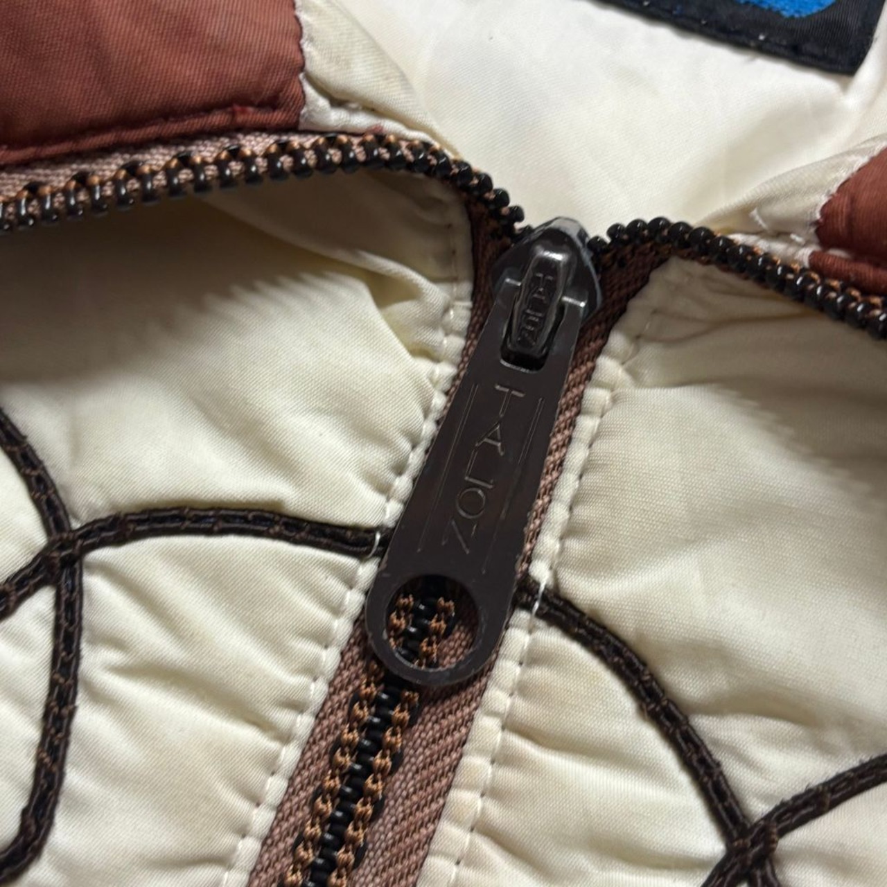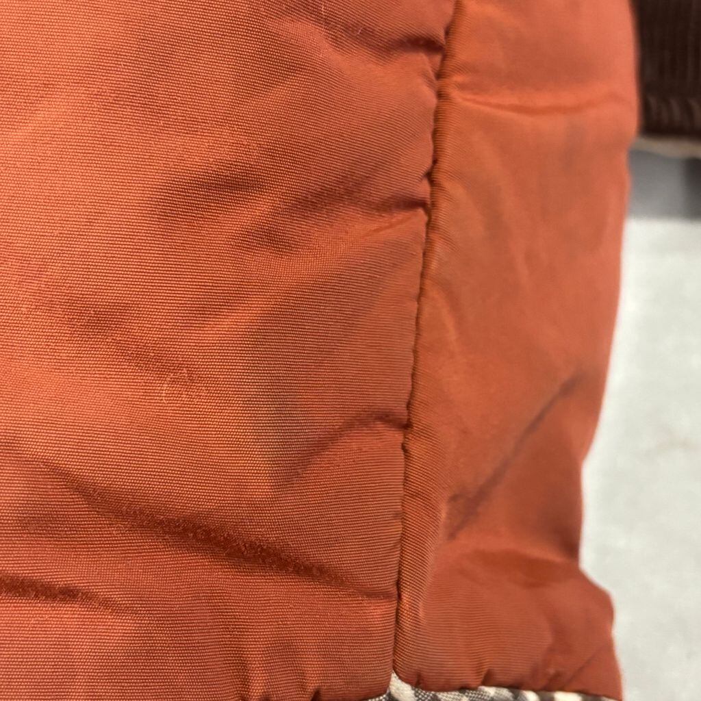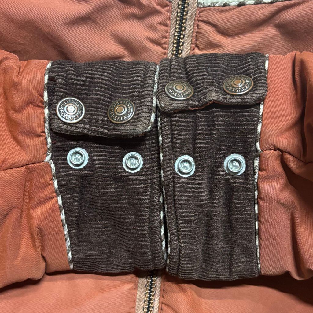 テラコッタ寄りのくすんだレッドに、アイボリー×ブラウンの切り替えヨーク、TALONジップと、ディテールも満載。