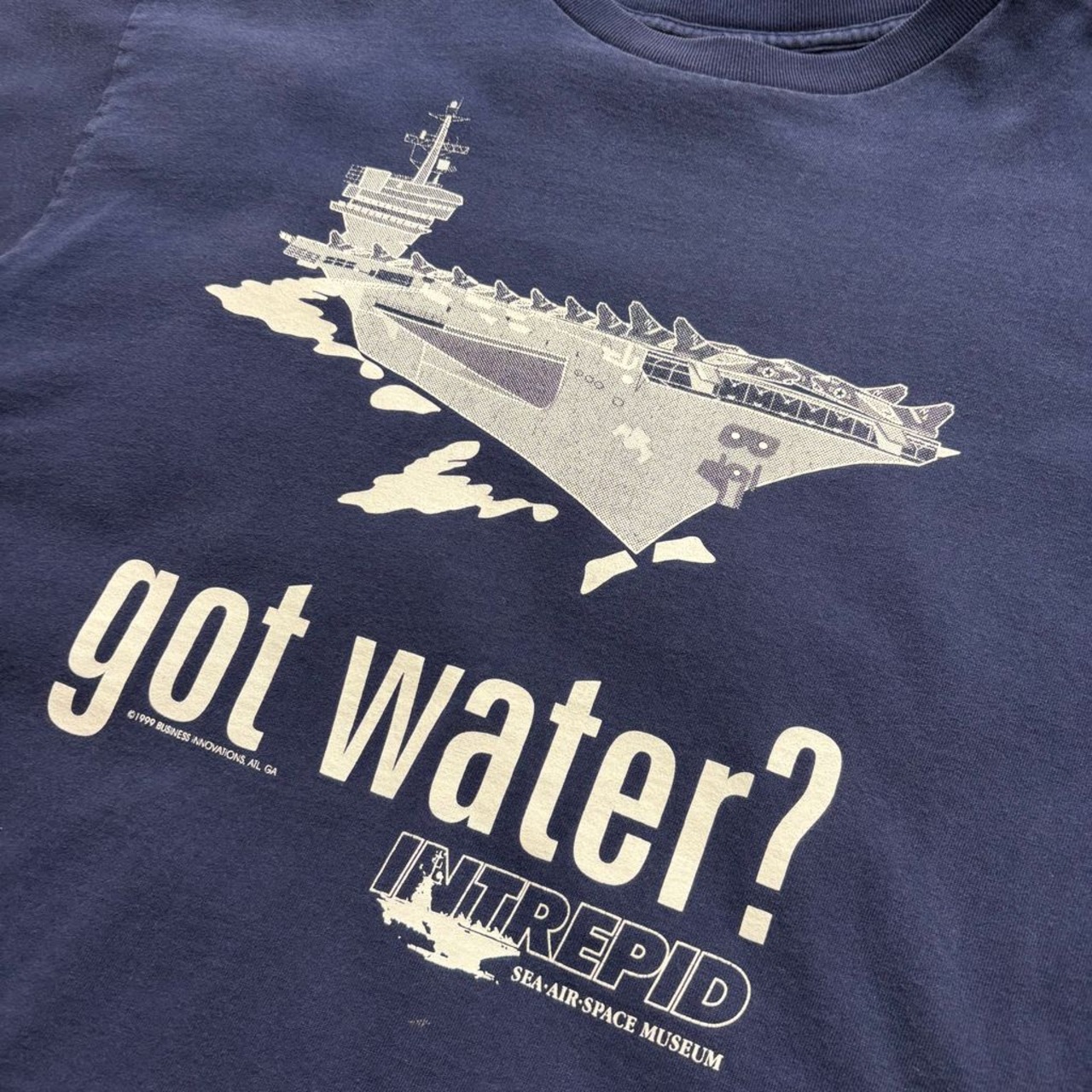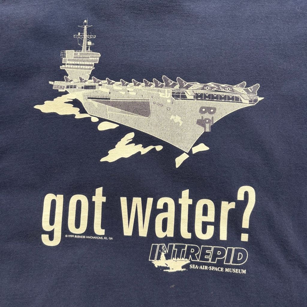 “got water?”——クールな皮肉とともに空母が現れる、1999年コピーライト表記のアメリカン・ミリタリーテイストTシャツ。