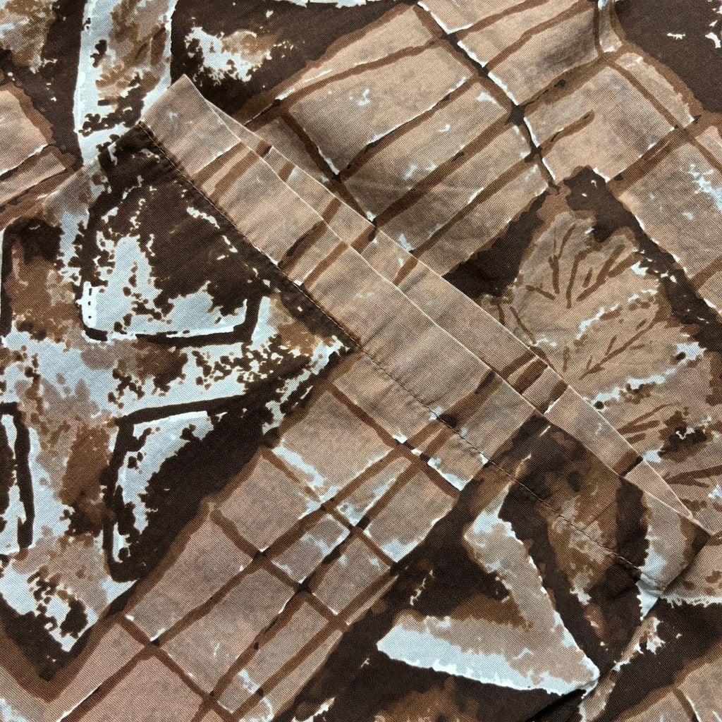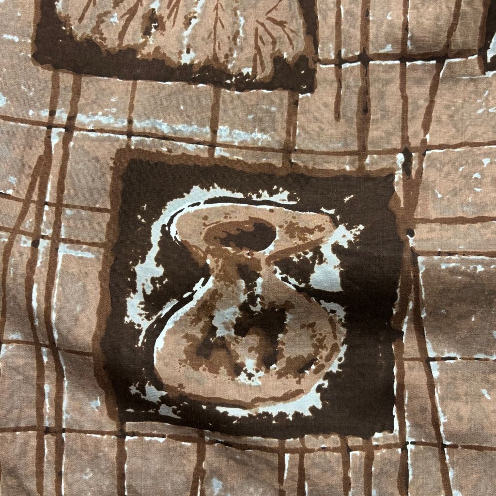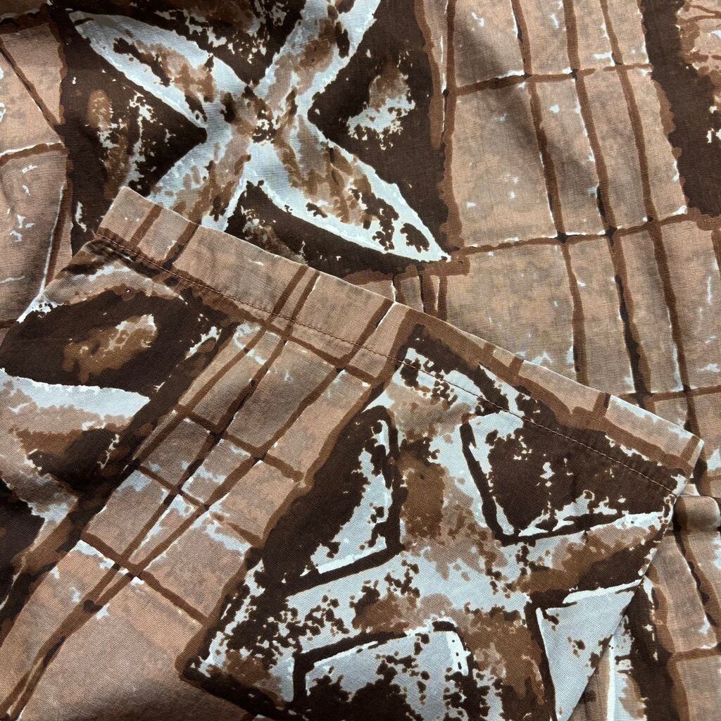 黄金期ならではの手の込んだ総柄プリントで、タパ柄や植物・器のモチーフをブロック状に配置したユニークなデザインが魅力。