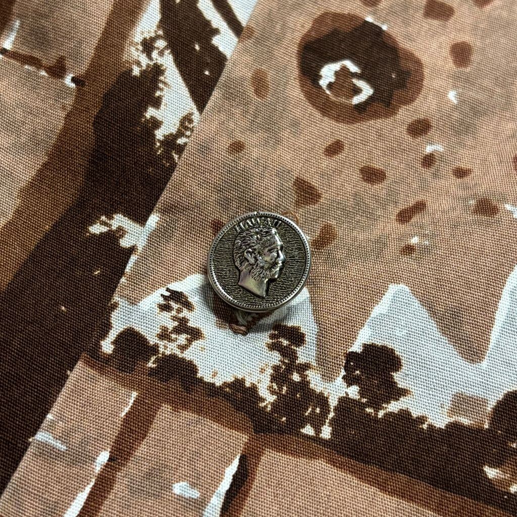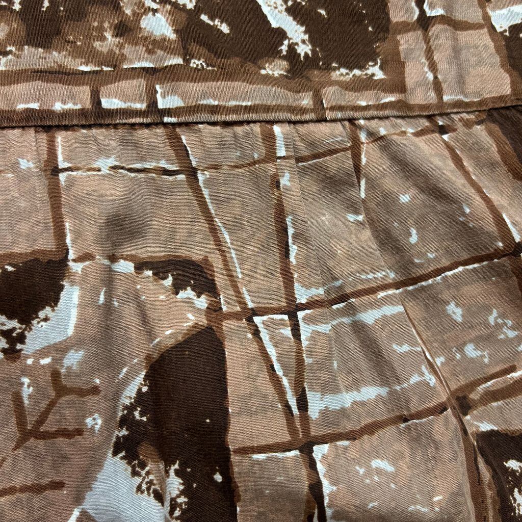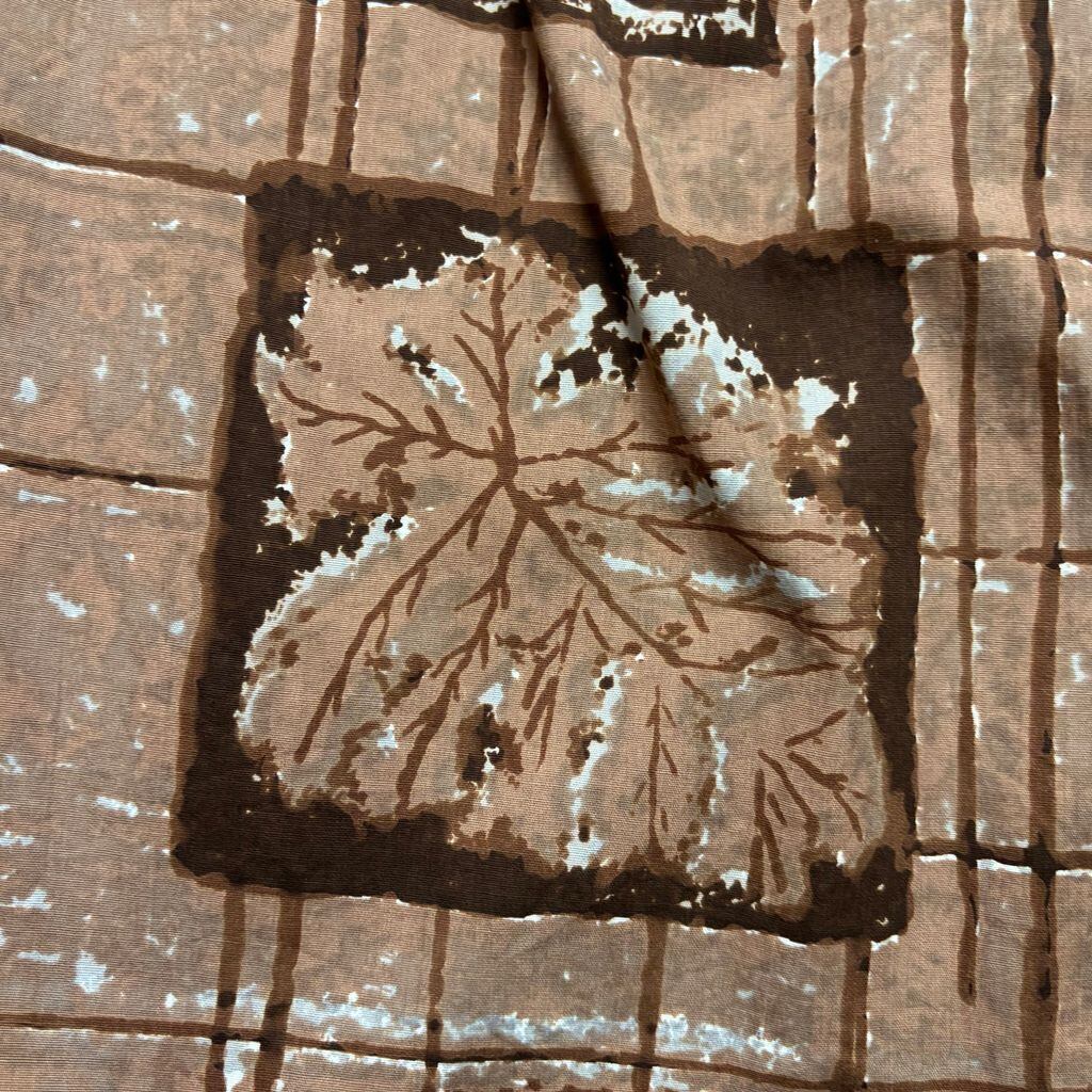 黄金期ならではの手の込んだ総柄プリントで、タパ柄や植物・器のモチーフをブロック状に配置したユニークなデザインが魅力。