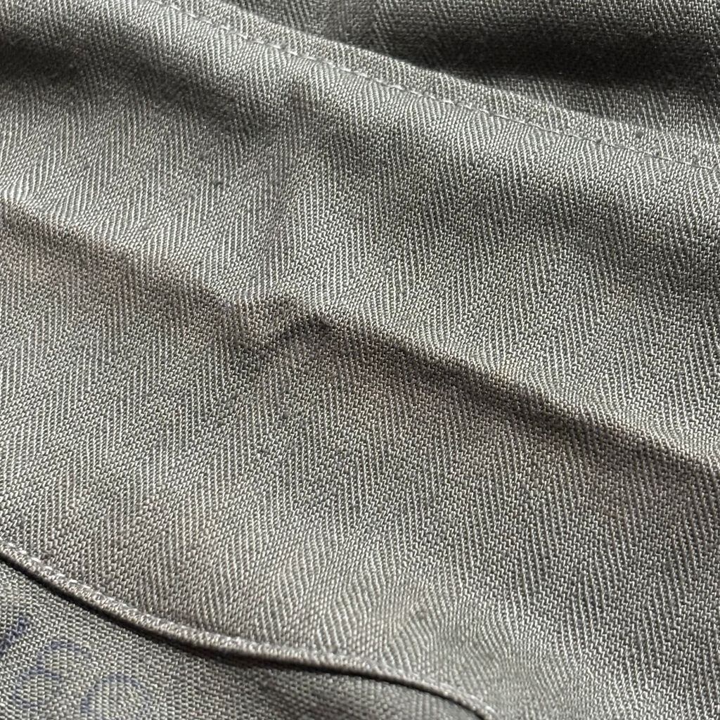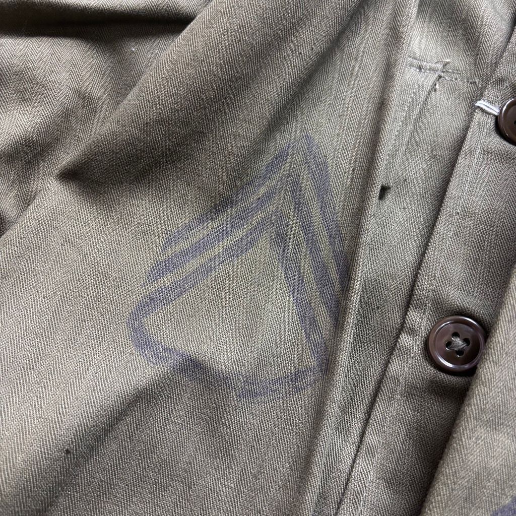 素材は丈夫なコットン100%のヘリンボーンツイル。素材で、ワークにもミリタリーにもマッチする風合いが抜群に良い生地です。両袖には階級章(サージェント)がステンシルプリントで施され、当時の雰囲気を色濃く残しています。