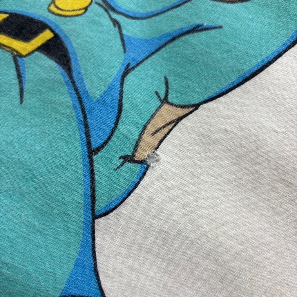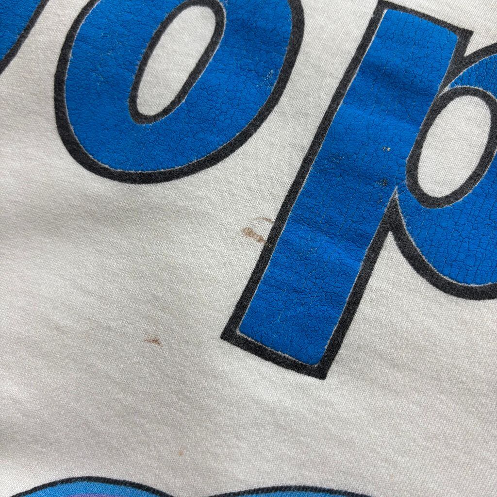 とぼけた表情と大胆な構図がたまらない、フロント一面プリント。古着ならではのフェード感とプリントのクラックも味わい深く、着るだけで“わかってる感”が出る一枚です。