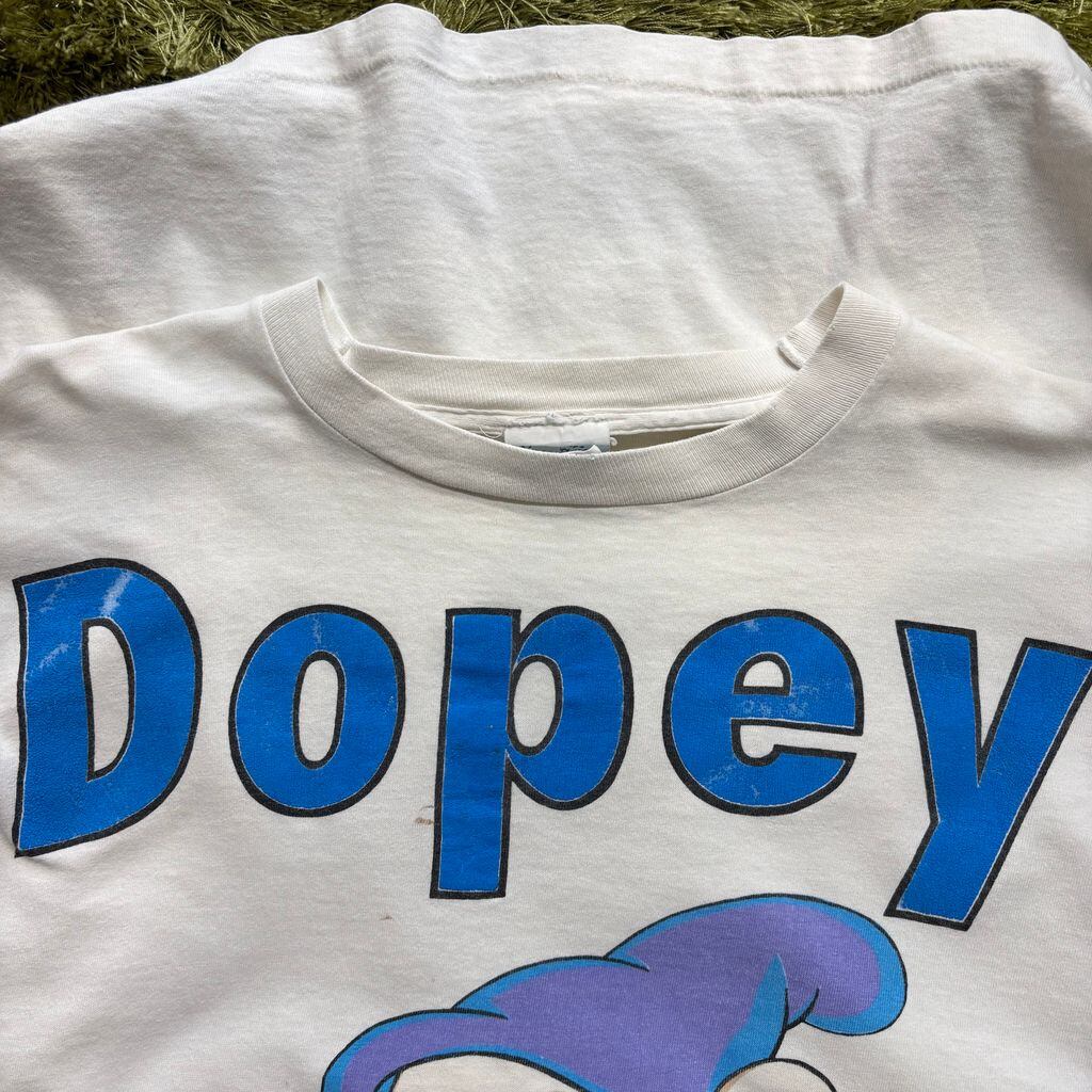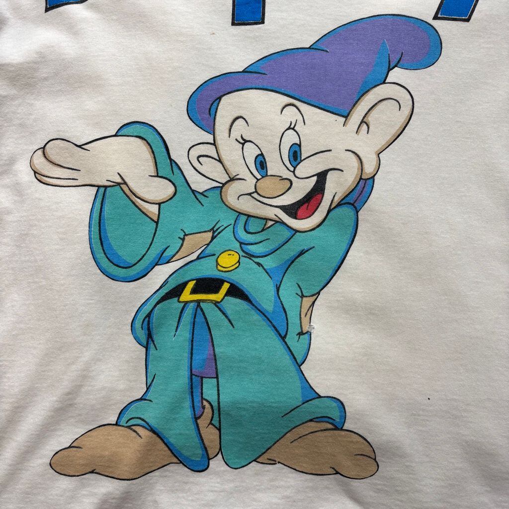 ディズニー映画『白雪姫』より、おとぼけキャラでお馴染みの「ドーピー(Dopey)」が大きくプリントされた90年代のTシャツ。