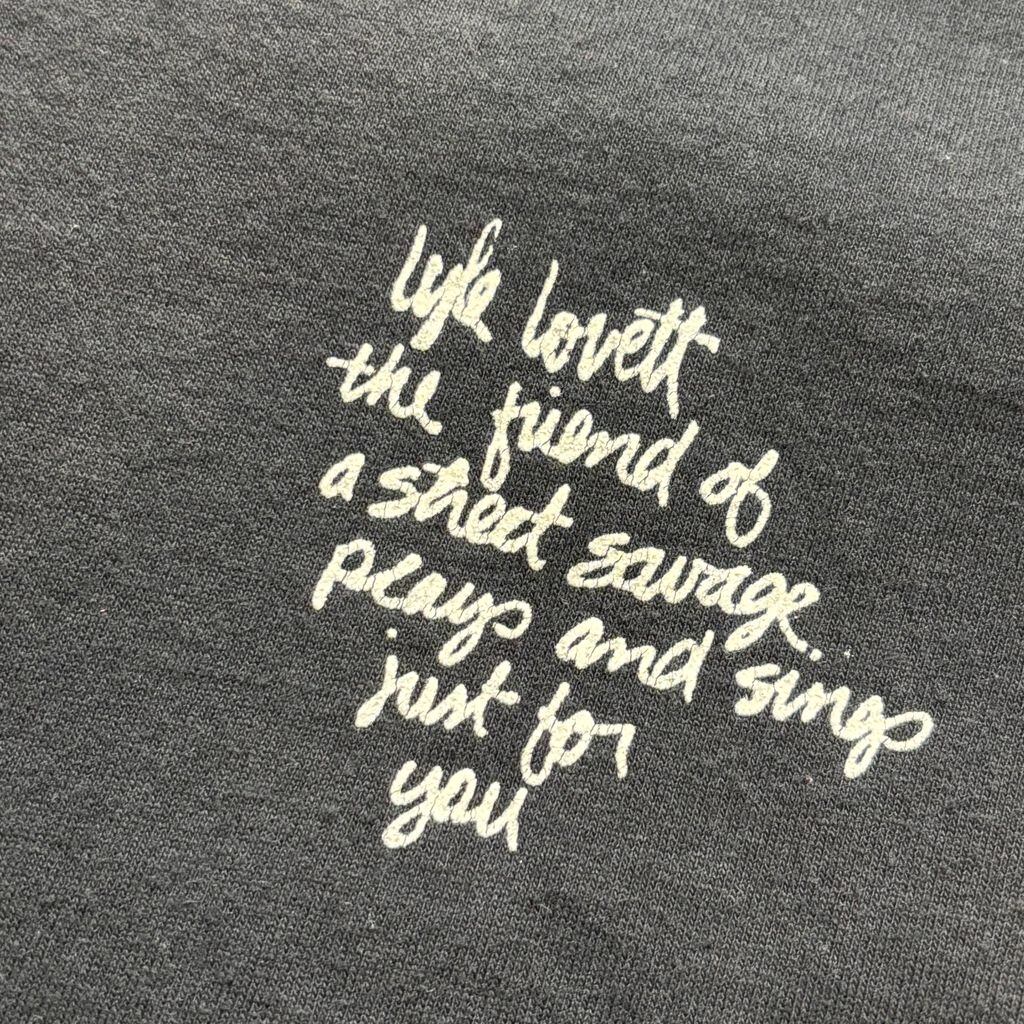 アメリカのシンガーソングライターLyle Lovett(ライル・ロヴェット)の名が胸元に綴られた、ひとクセあるユーモアTシャツ。