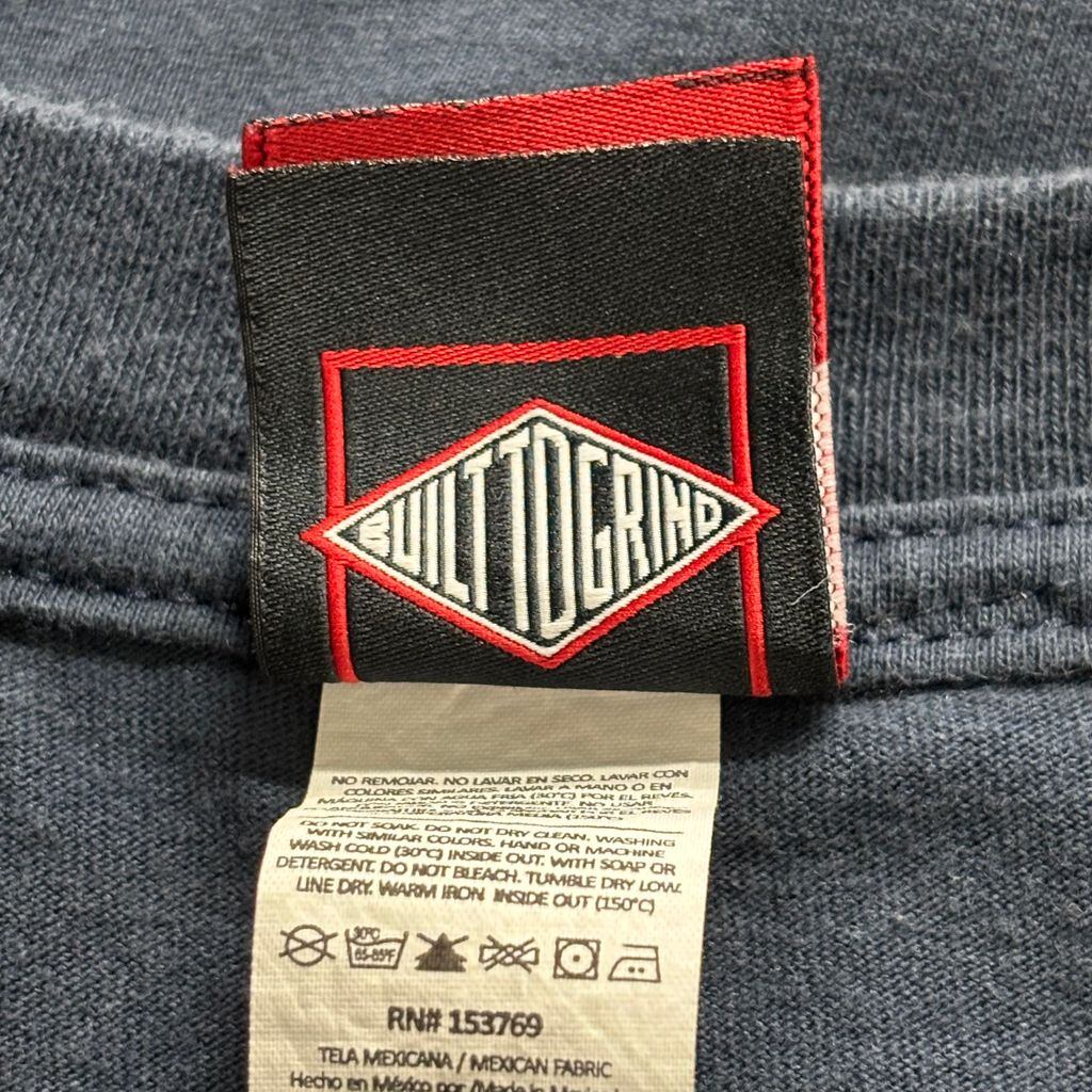 色味は濃いめのネイビー(フェード具合も◎)、ボディはタフなメキシコ製で、タグには「BUILT TO GRIND」の名文句入り。