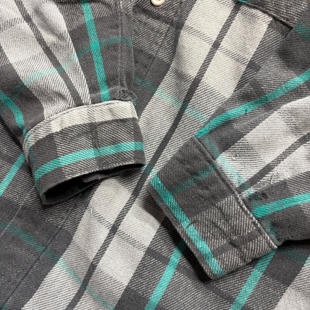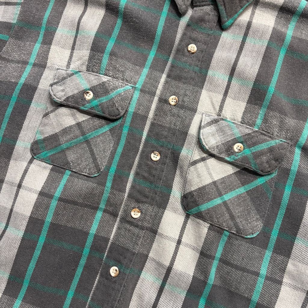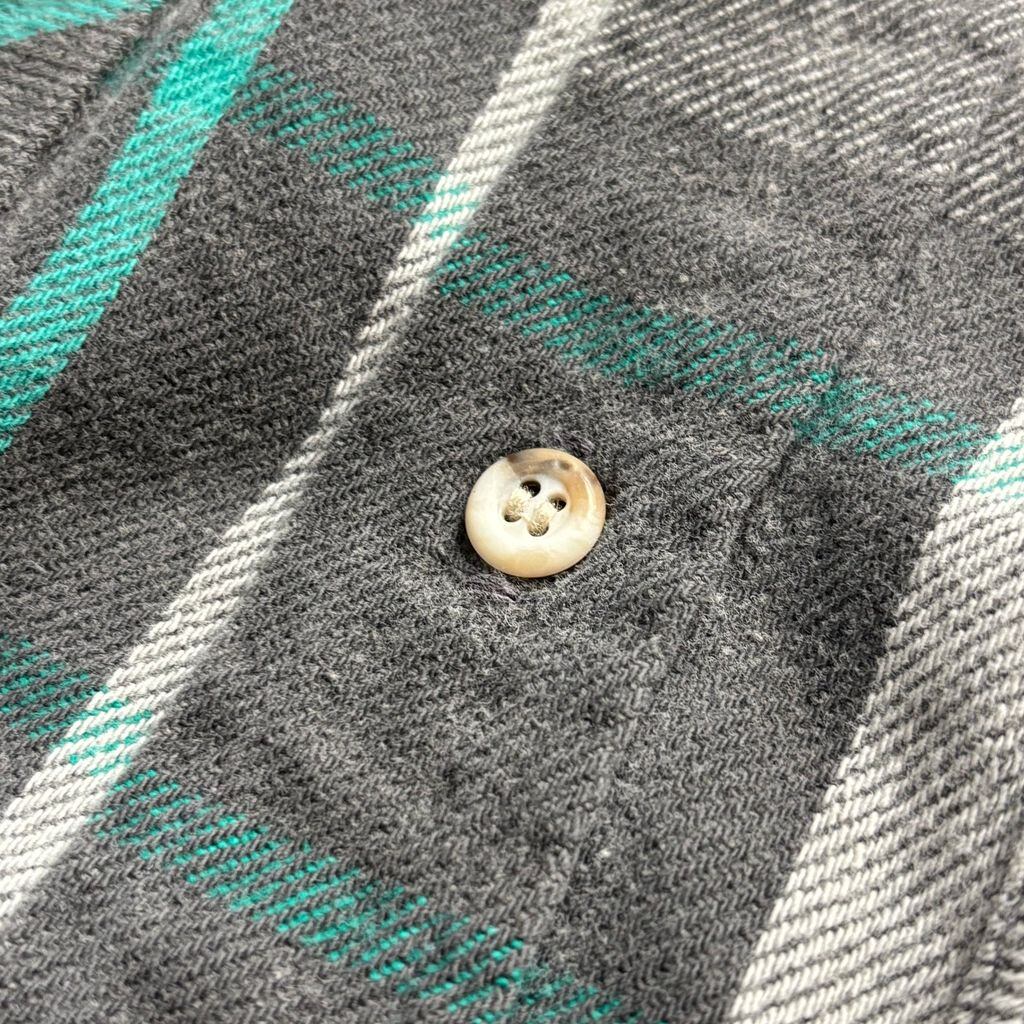 グレーをベースにグリーンのラインが映えるクラシックなチェック柄。肉厚で起毛感のあるフランネル生地は、90年代頃のアメリカ製らしいタフな作り。両胸にフラップポケットが付いた実用的なディテールも魅力です。