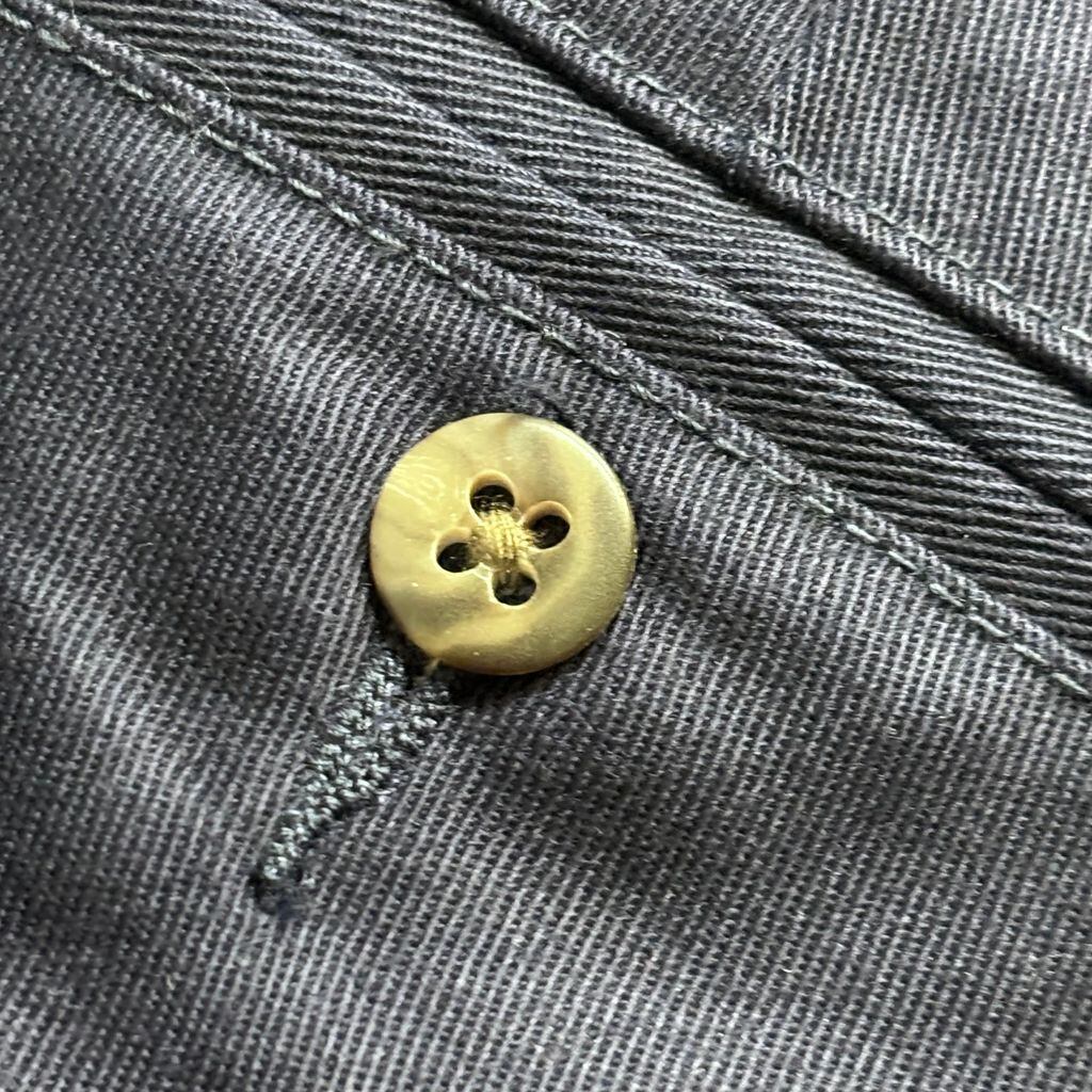 フロントはYKKジップ、バックポケットは、両方ボタン留めで実用性も兼ね備えています。