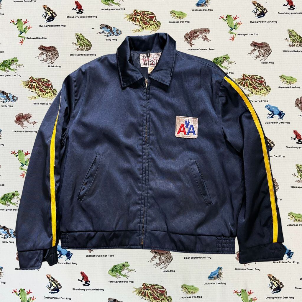 アメリカン航空のワッペンが胸と背中に付き、航空会社スタッフ用として実際に使用されていたと思われる一着で、フロントとバックには存在感抜群の AAロゴの刺繍ワッペン。袖に施されたイエローストライプがアクセントになり、シンプルながらスポーティな雰囲気を演出します。
