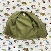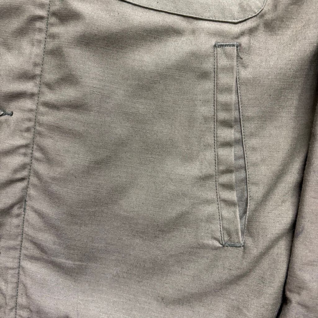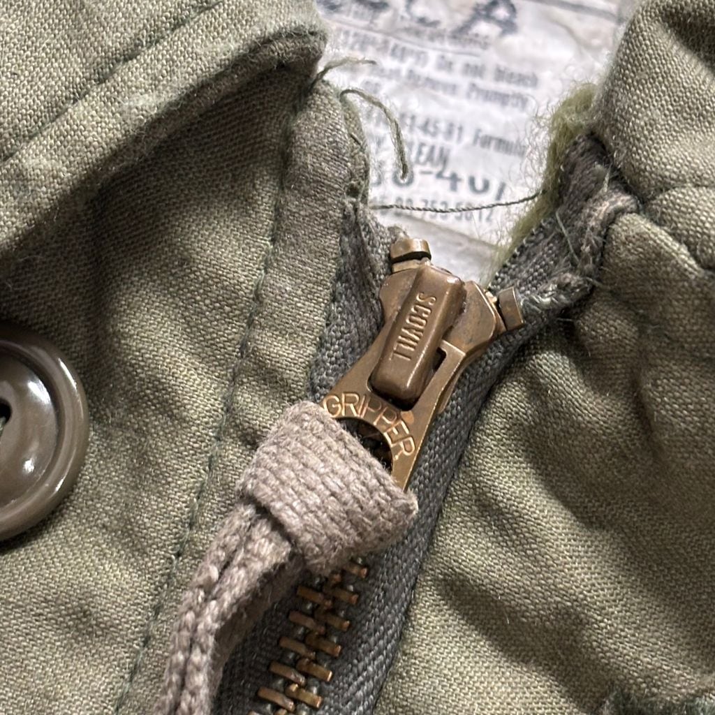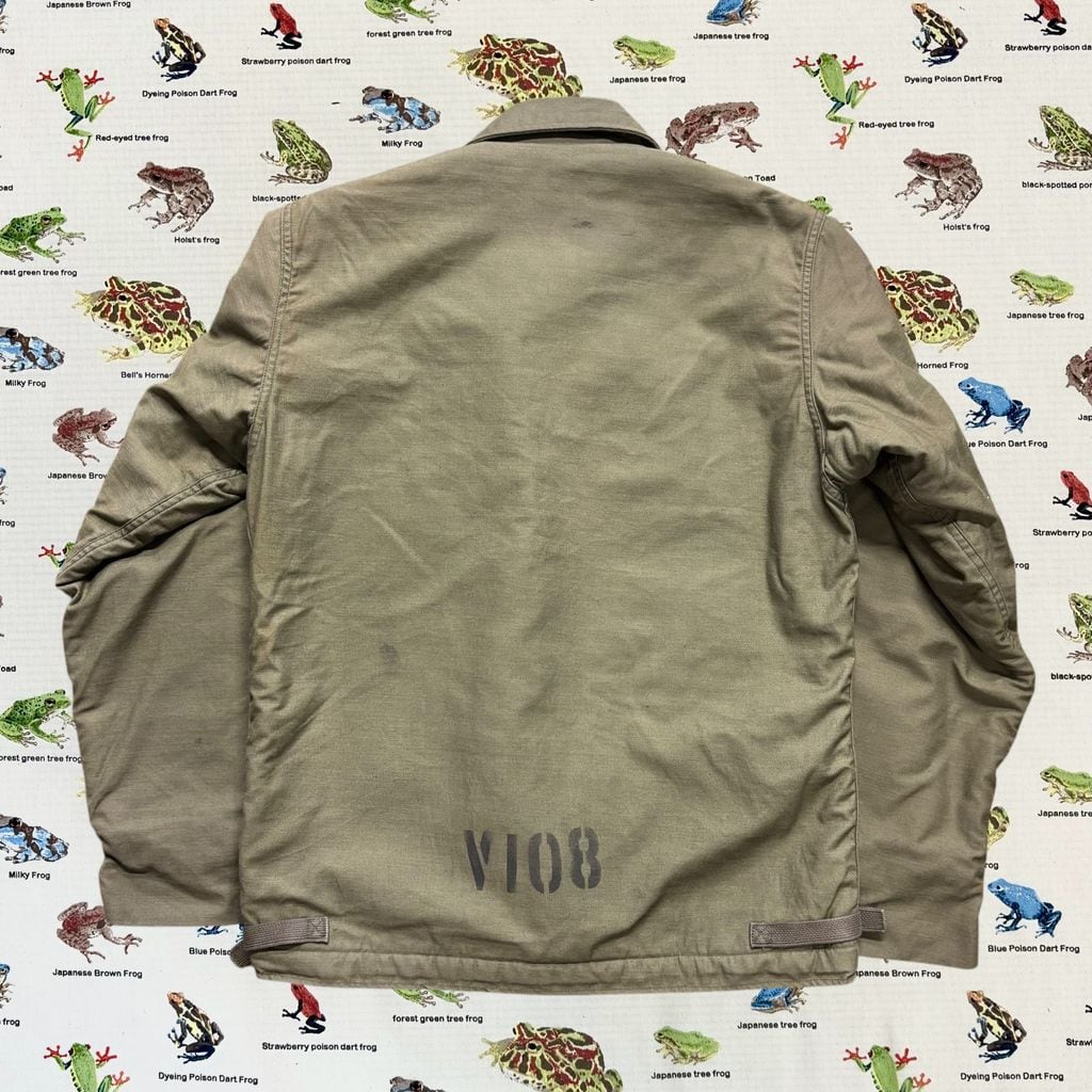 表地はタフなコットンサテン、裏地はふかふかの化学繊維素材のブランケットで防寒性も抜群。フロントはジッパー+ボタンの比翼仕様で、当時の実用性が色濃く反映されています。さらに背面には「V108」のステンシルが残っており、当時のミリタリーらしい雰囲気を感じさせます。