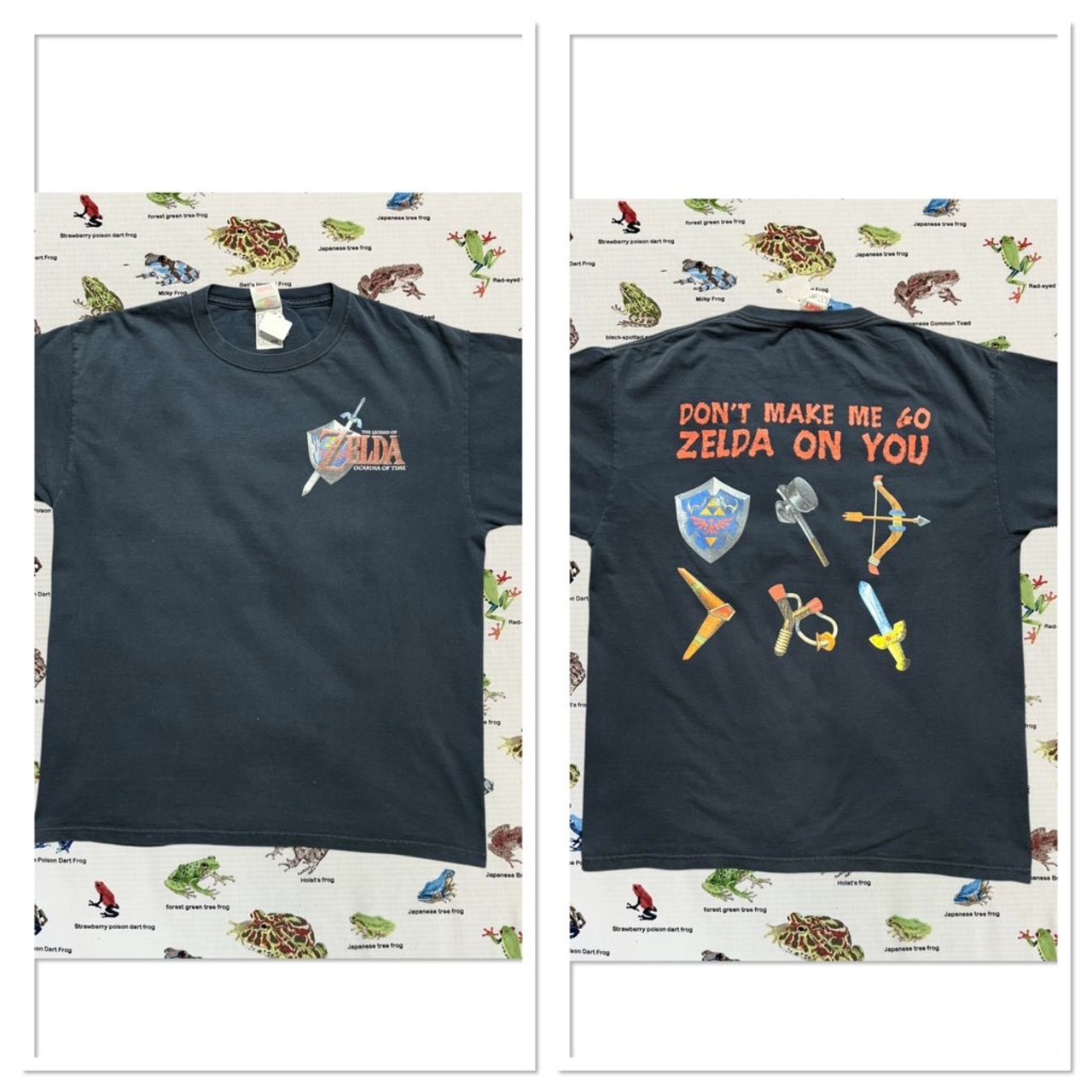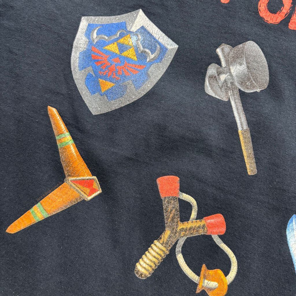 フロントにはおなじみのシリーズロゴ、バックには「DON’T MAKE ME GO ZELDA ON YOU」のメッセージとゲーム内アイテムが大胆にプリントされた、当時の空気感を色濃く残す一着です。