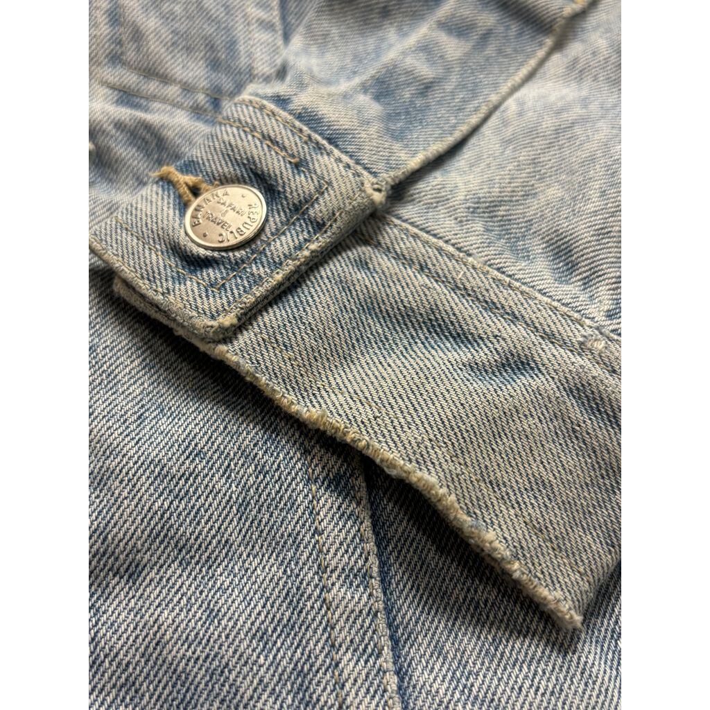 程よく色落ちしたライトブルーデニムに、胸ポケットや裾のレザーパッチなど、当時らしいディテールが魅力の一着です。