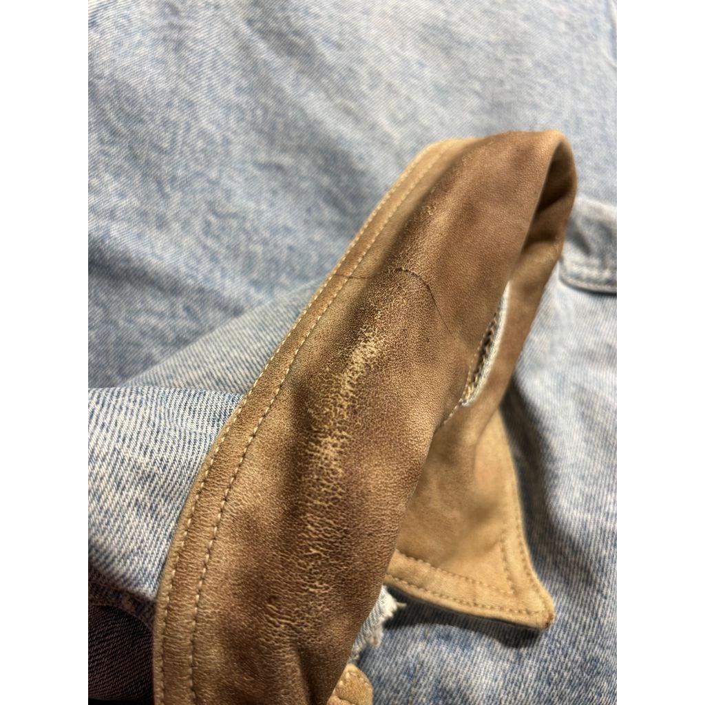 ライトブルーデニムに、ブラウンのスエードレザー襟を組み合わせたクラシカルなデザイン。