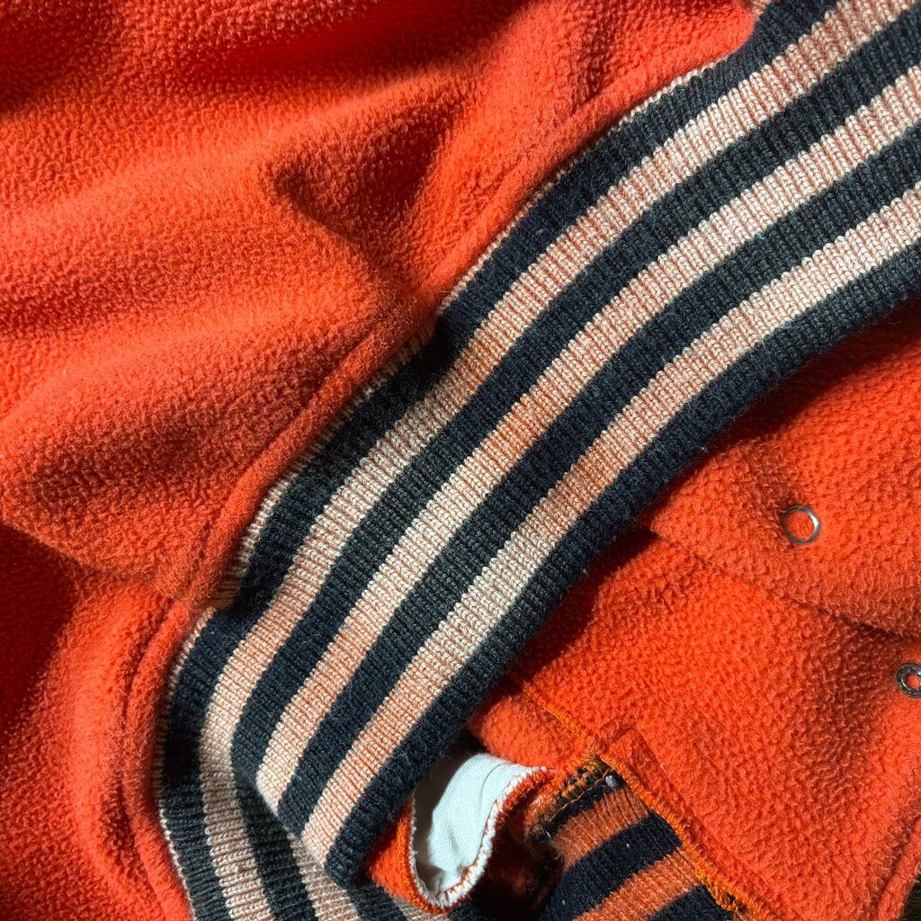 オレンジのフリースボディに、ナイロン素材のブラックスリーブを組み合わせた個性的な一着。