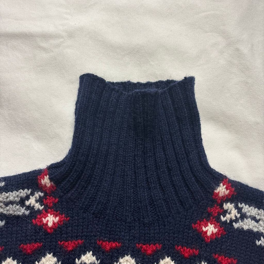 量産の機械編みにはない、優しい膨らみと空気を含んだような暖かさが特徴です。首元まで包み込むタートルネック仕様で、真冬の外出にも心強く、コートの下から柄が少し見えるだけでスタイリングの主役になります。